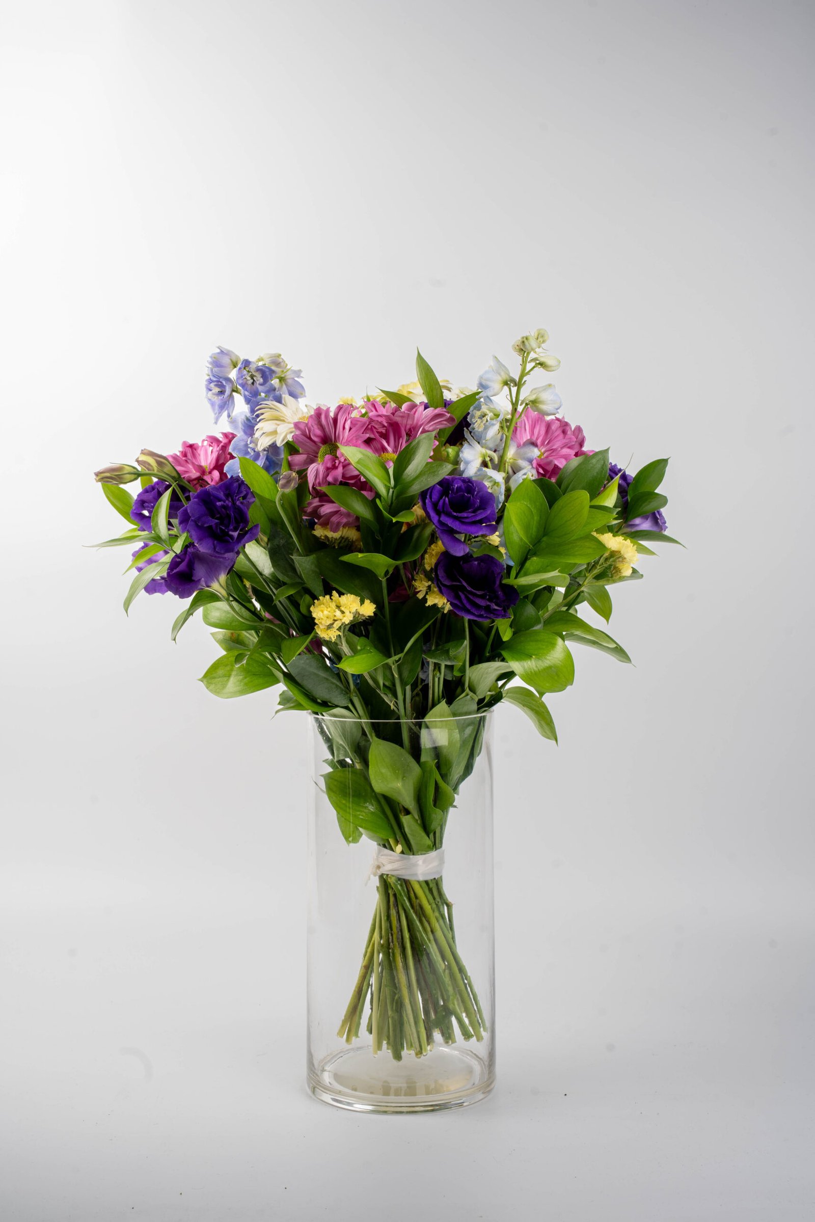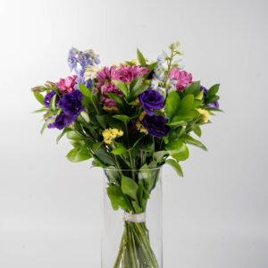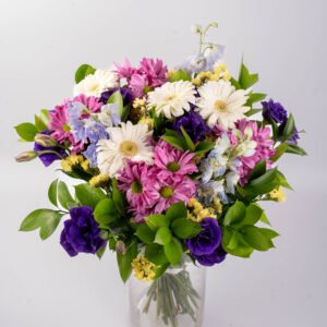 זר מרהיב המשלב גרברות , חרציות, ליזיאנטוס אלגנטי ודולפיניום גבוה ומרשים. השילוב יוצר מראה עשיר, רענן והרמוני, עם נוכחות צבעונית שממלאת כל חלל באור ואנרגיה חיובית.מתאים כמתנה מרגשת לכל אירוע – ימי הולדת, חגיגות, או פשוט כדי לשמח מישהו אהוב.